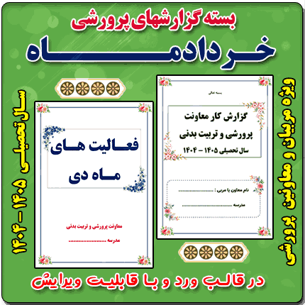بسته گزارش های معاون پرورشی خردادماه 1405 شامل 10 گزارش در قالب ورد و با قابلیت ویرایش می باشد . این بسته شامل هر سه مقطع ابتدایی ، متوسطه اول و دوم می باشد و توسط تیم ما طراحی و تولید شده است . این بسته مناسب برای چاپ و قراردادن در کلربوک برای ارائه به بازدیدکنندگانی هست که از اداره به مدرسه مراجعه می کنند و با این بسته مشکل مستندات همکاران تا حدود زیادی حل خواهد شد.